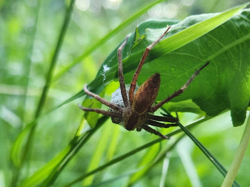 Like the nursery web spiders, the banded fishing spider does not weave a web for hunting purposes; rather, the females use their silk to wrap their eggs up and attach them first to the undersides of their body as they carry them around, and then to a rock or other hiding place as hatching time draws near. Also like the nursery web spider, this brown arachnid is not as bold as the first orbweavers, but there is something captivating about its size and stance.