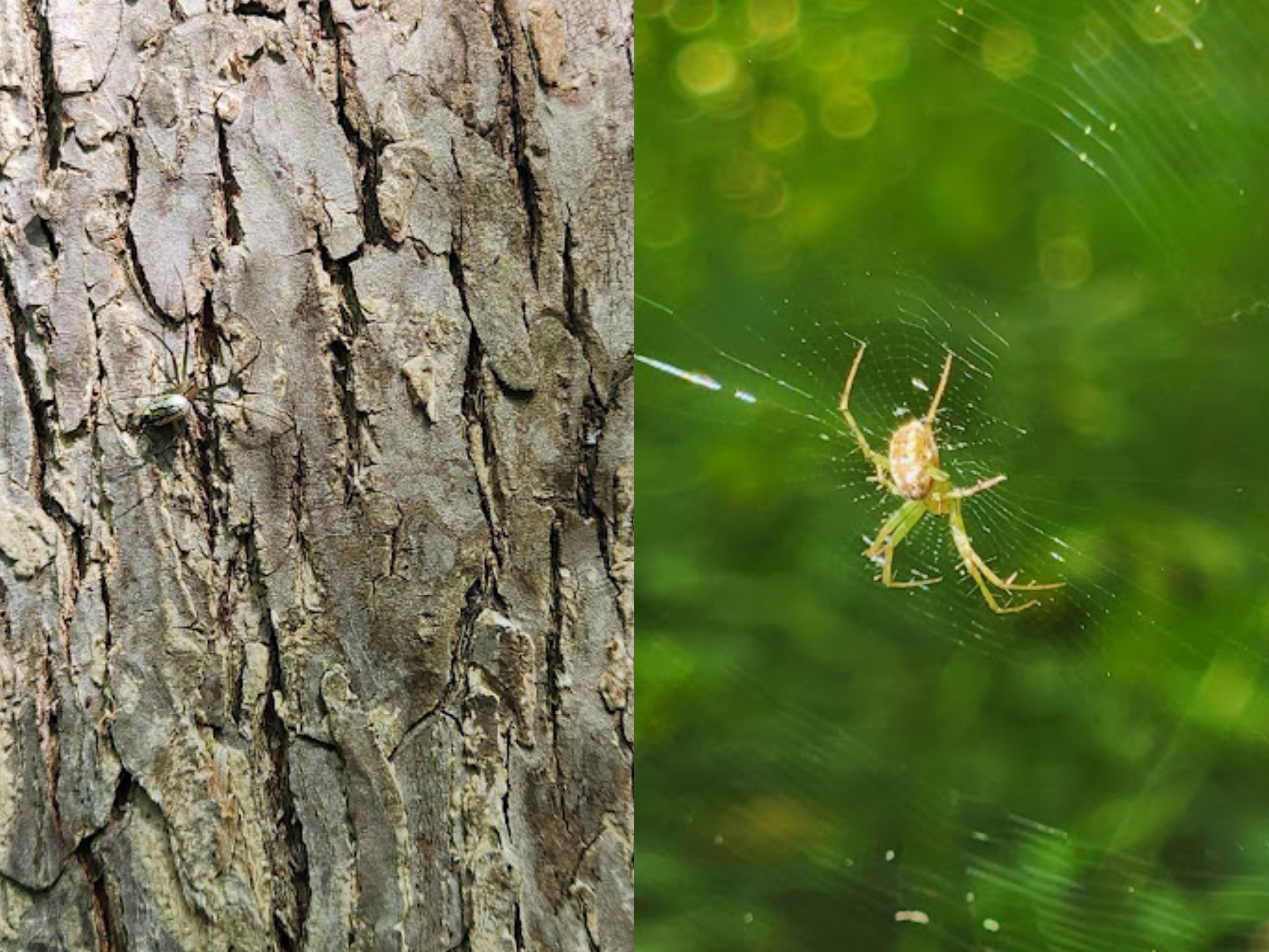 Left: An orchard orbweaver climbs up the bark of a tree in July. Right: A spider in the Mangora genus sits in the center of its web, waiting, in a forest in Durham Township in September.