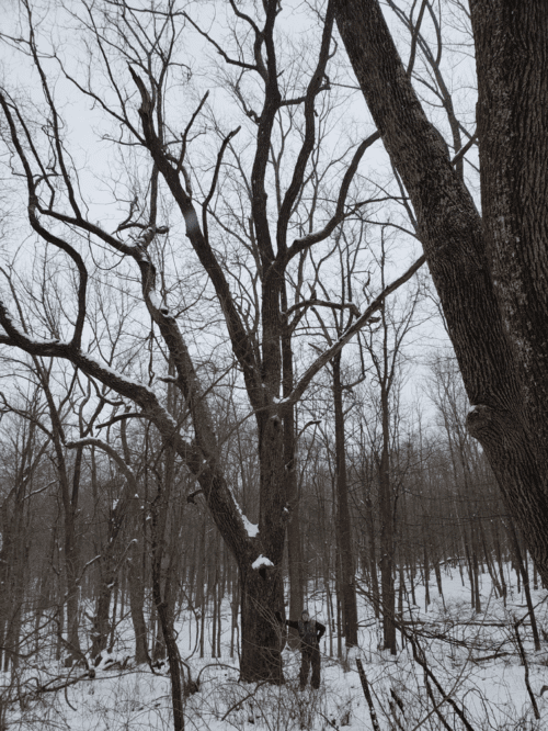 As the North American landscape changed and many forests were cut for pasture or timber harvests, some lucky wolf trees were able to remain, either for aesthetic purposes or to help mark property boundaries. Wolf trees can be seen on several of our larger preserved properties, particularly those with agricultural backgrounds! The one found on our Fuller/Pursell Nature Preserve aligns exactly with the property’s history. It is located at the edge of the red cedar forest and has some aged wire fencing running through its trunk, suggesting that it was at one time a boundary marker. Hart’s Woods Preserve and the Fisher Preserve are a couple of other properties that have a wolf tree present. Jim Drennan, our Senior Conservation Steward, explains the history of these trees well: