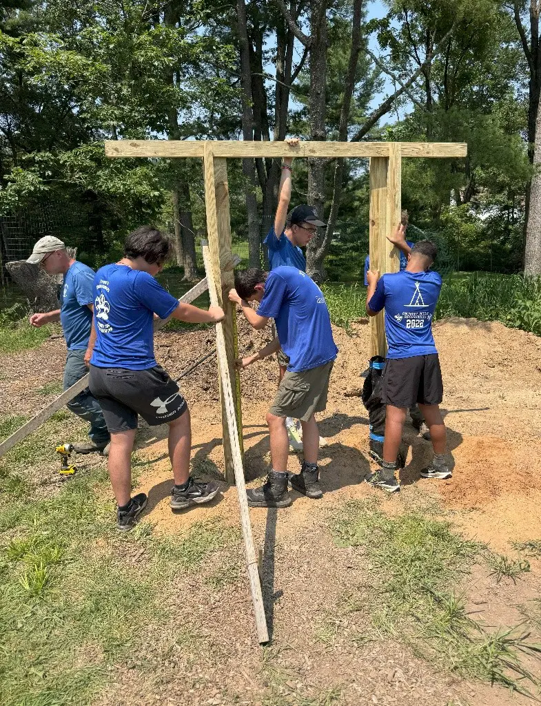 Scouts from Troop 71 build the information kiosk at Russell-Mandel Preserve