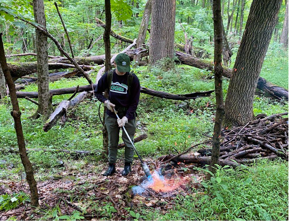 Shown: A backpack torch being used to control Japanese Barberry (invasive species). This work must be done carefully, but it is an important tool in our stewardship toolbelt! One of the biggest benefits of this practice is that spot-burning can be applied to a single plant or a small population of plants with little to no disturbance to the surrounding vegetation.