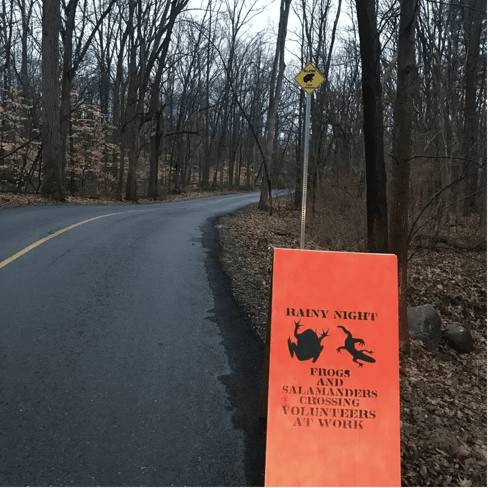 Shown: A warning sign to oncoming drivers during our amphibian crossings. Whether you see our signs or not, remember to drive slowly and carefully on migration nights!