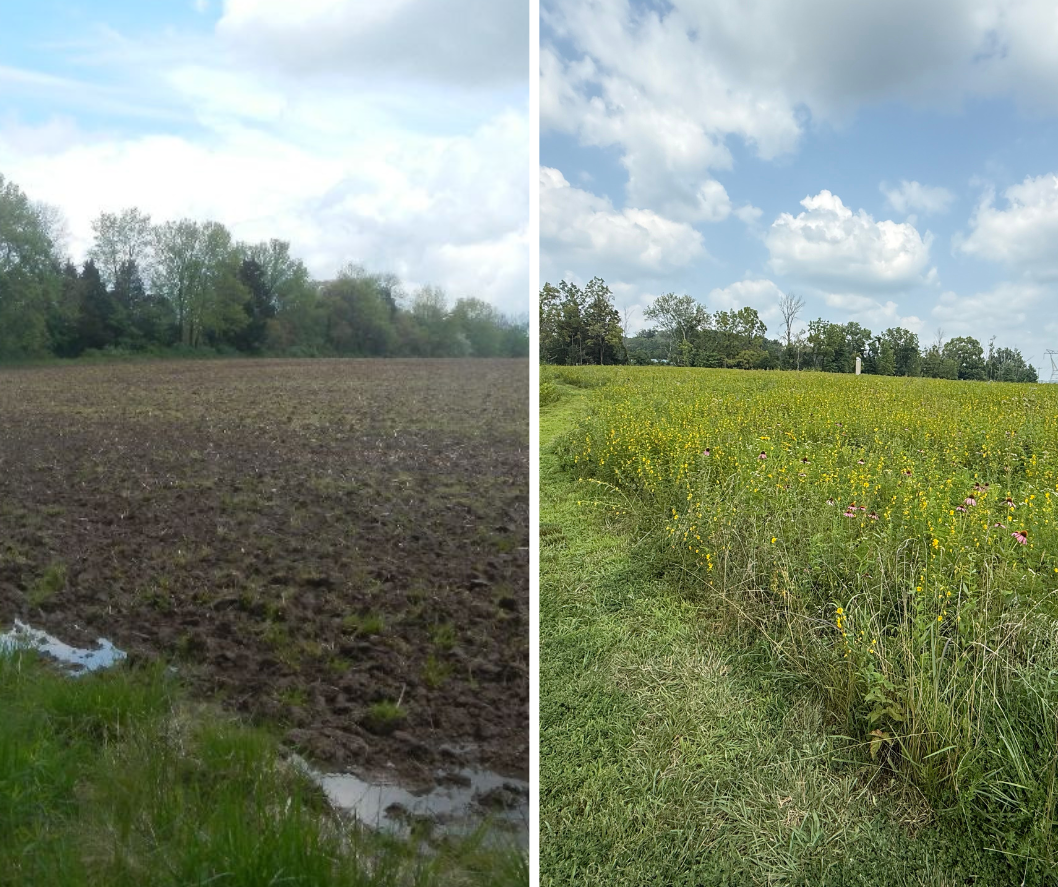 Before: former agricultural field. After: blooming native pollinator meadow.