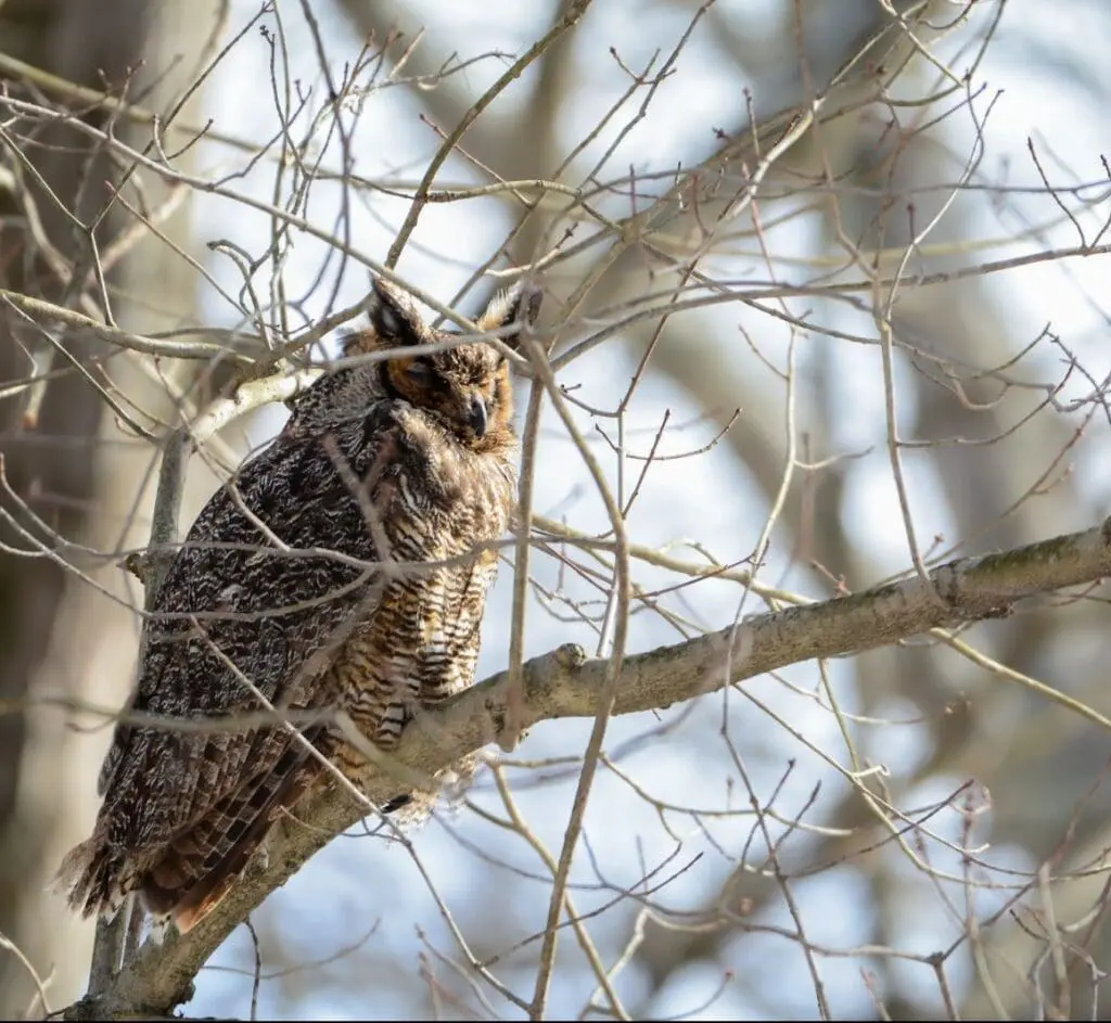 A sleepy Great Horned Owl, normally hidden, stands out quite easily on a leafless branch.