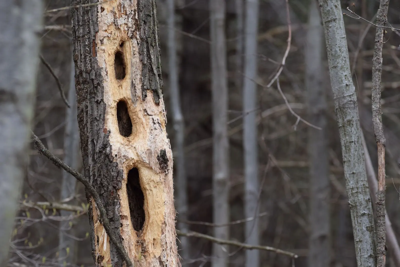 Evidence of Pileated Woodpeckers. Note the ovular, almost rectangular shape of the holes.