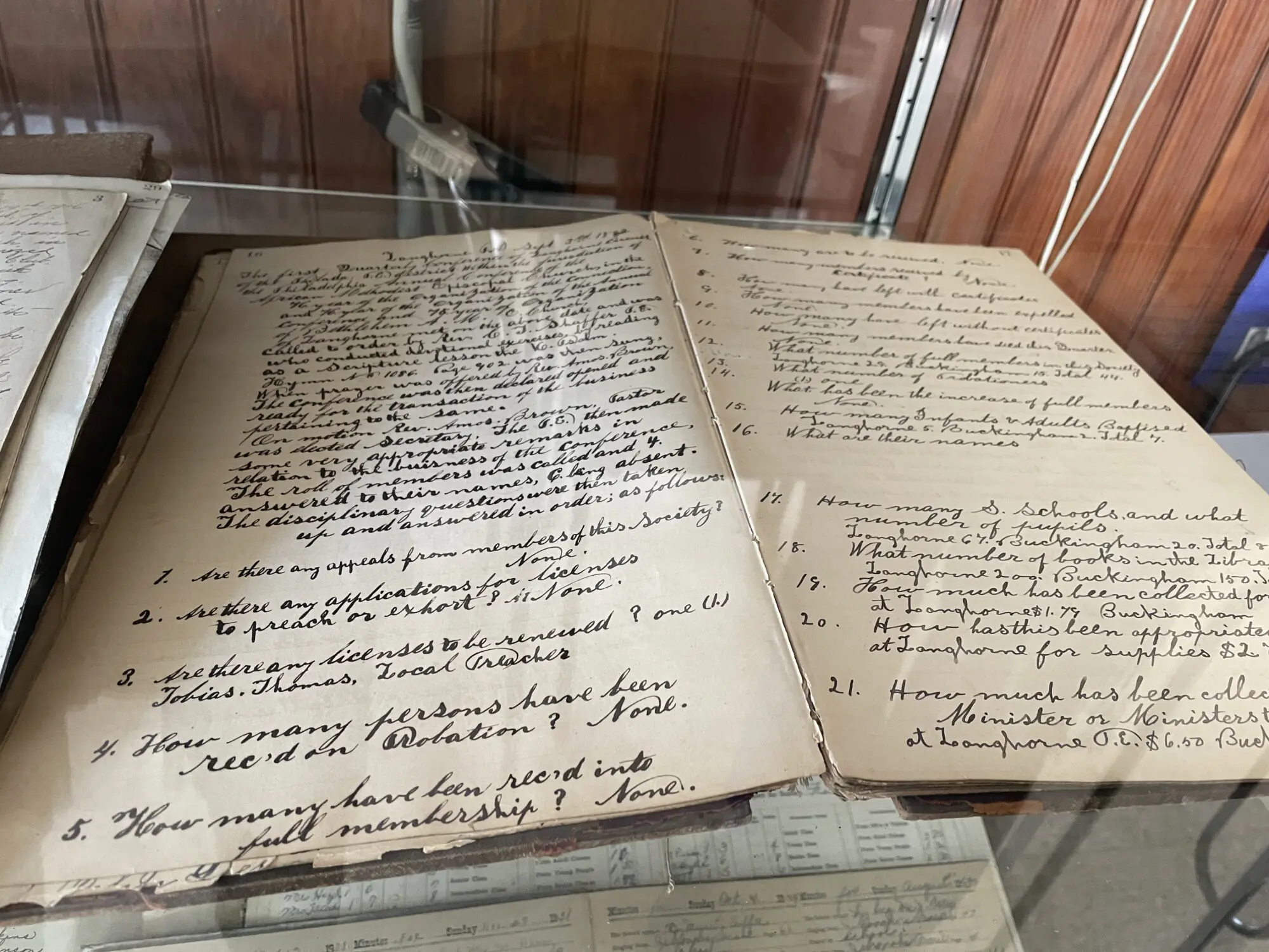 The oldest part of the church sits in the footprint of the original log cabin that housed the delegation. Here you will find glass cases holding centuries of church records and historic sermons, plus part of the pulpit from which Richard Allen preached. Records, awards, plaques, and documents are preserved with care and shared proudly, alongside more recent photos.